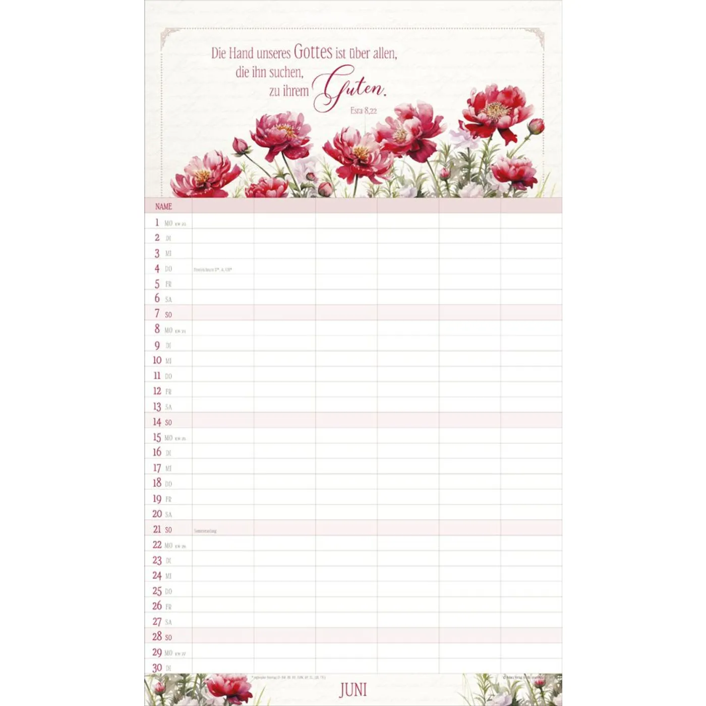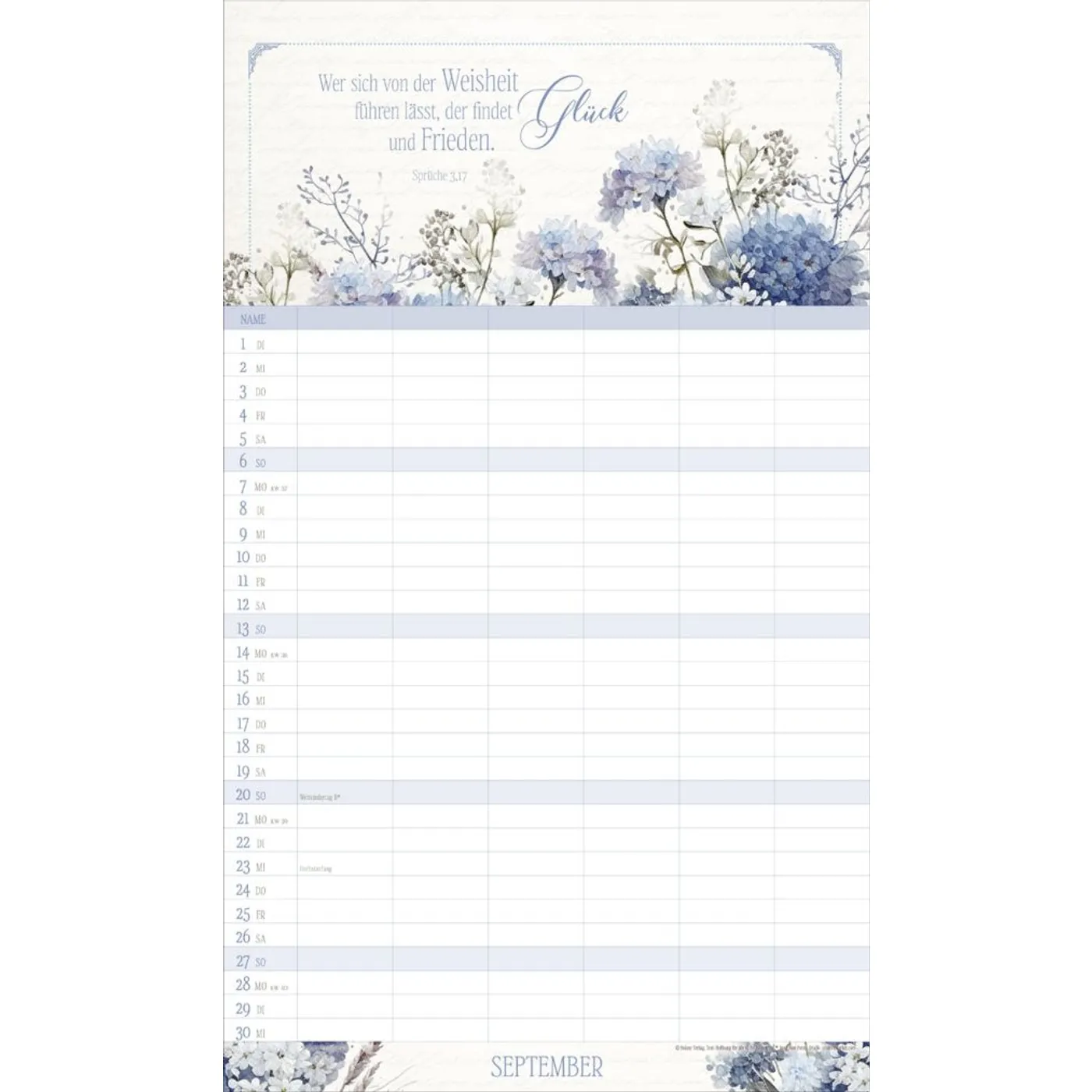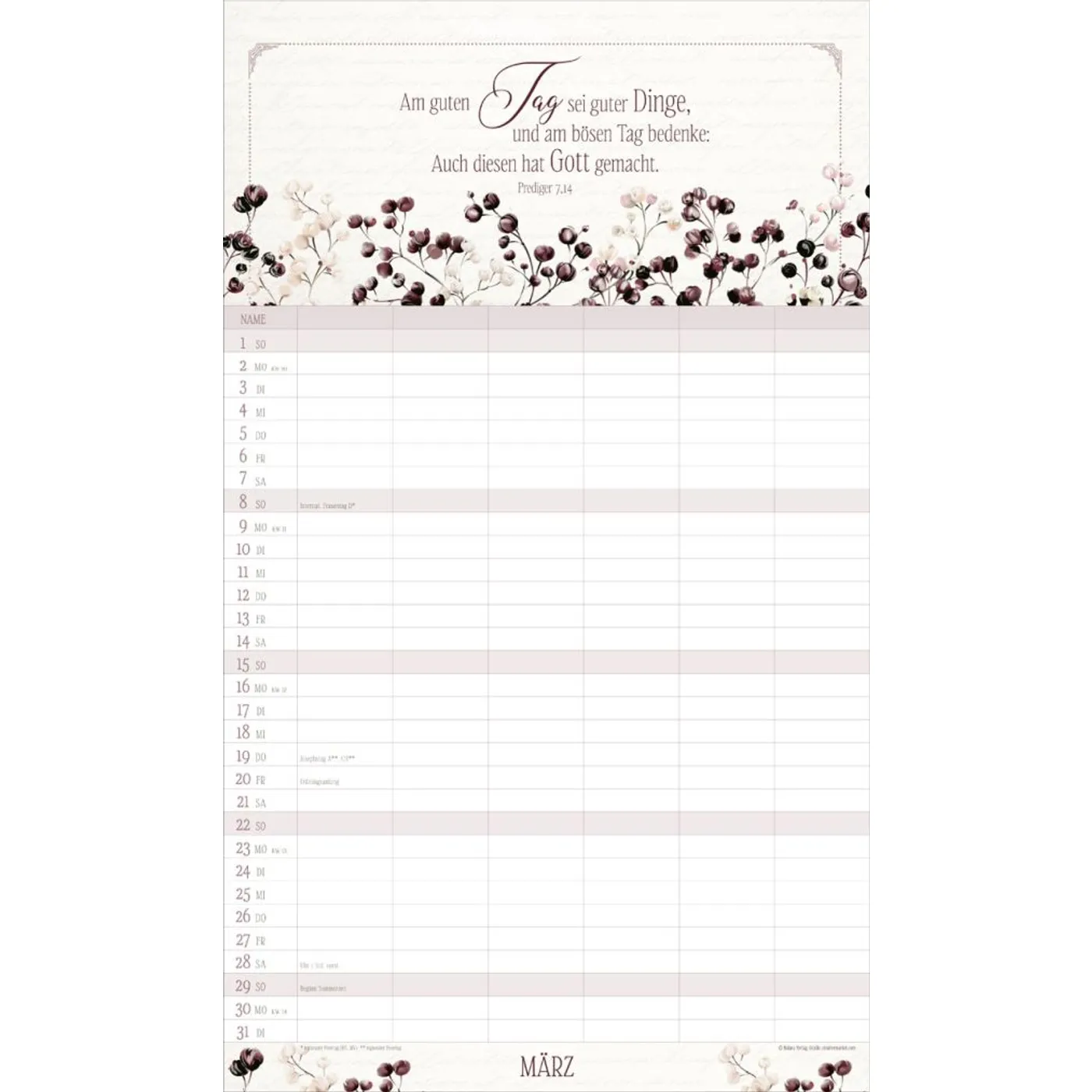 Mit 6 Spalten organisieren Sie spielend die Termine Ihrer Familienmitglieder. Ein übersichtsichtlicher Ferienplaner und sorgfältig ausgesuchte Texte und Bibelverse runden das harmonische Design ab. Bei dieser dekorativen Gestaltung macht Planen einfach Spaß. Mit Schulferien auf dem Rückblatt.