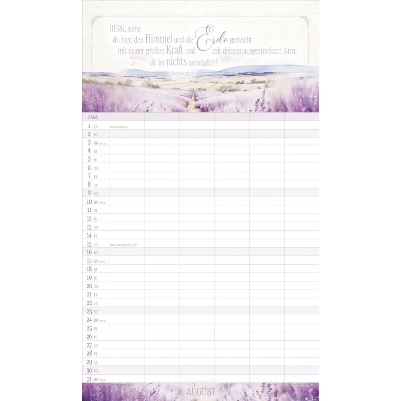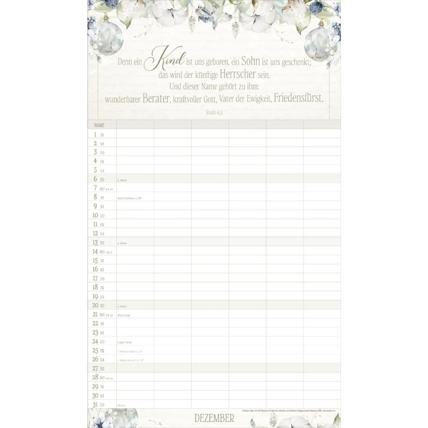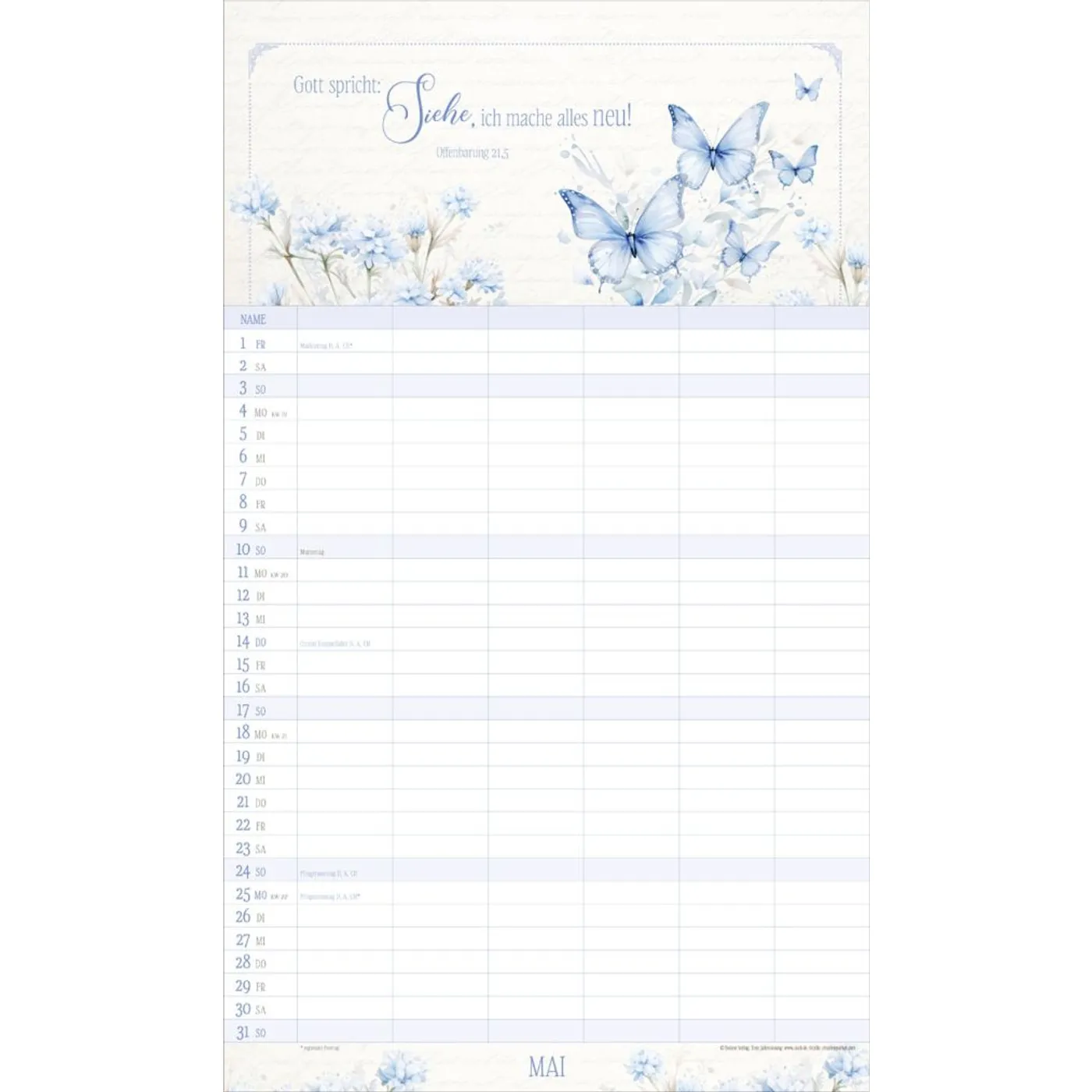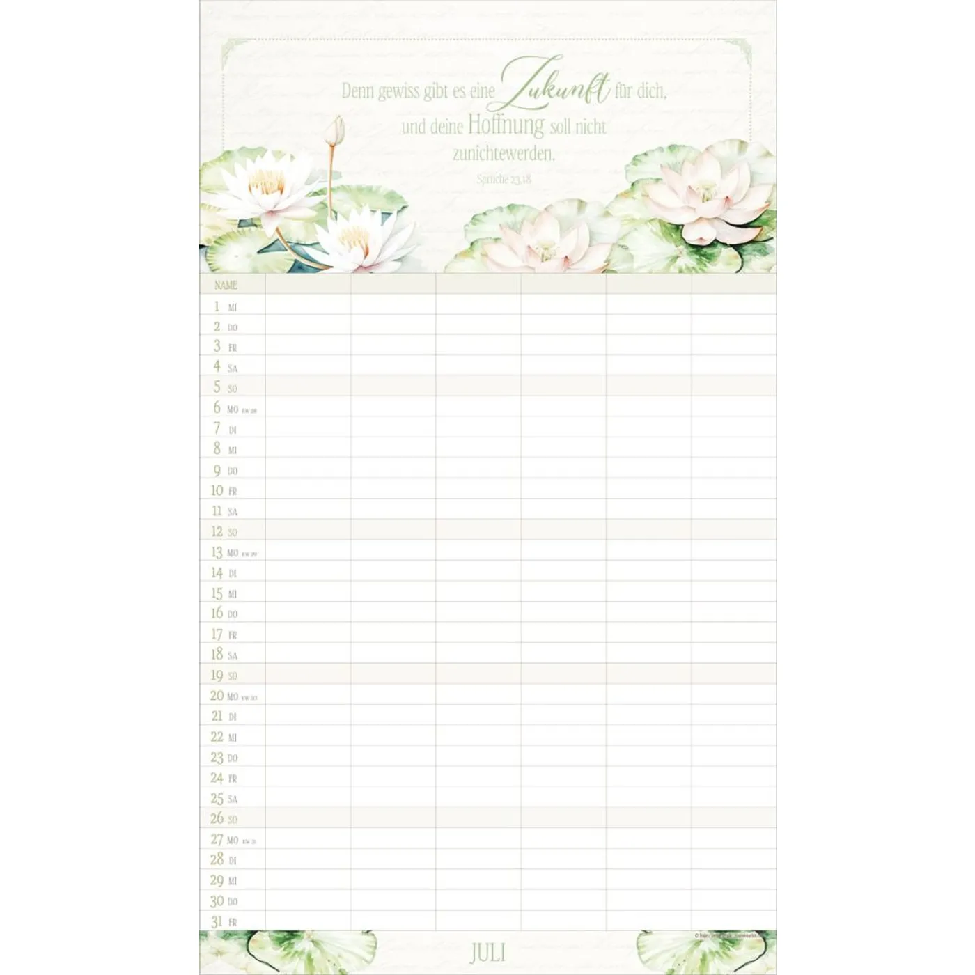 Mit 6 Spalten organisieren Sie spielend die Termine Ihrer Familienmitglieder. Ein übersichtsichtlicher Ferienplaner und sorgfältig ausgesuchte Texte und Bibelverse runden das harmonische Design ab. Bei dieser dekorativen Gestaltung macht Planen einfach Spaß. Mit Schulferien auf dem Rückblatt.