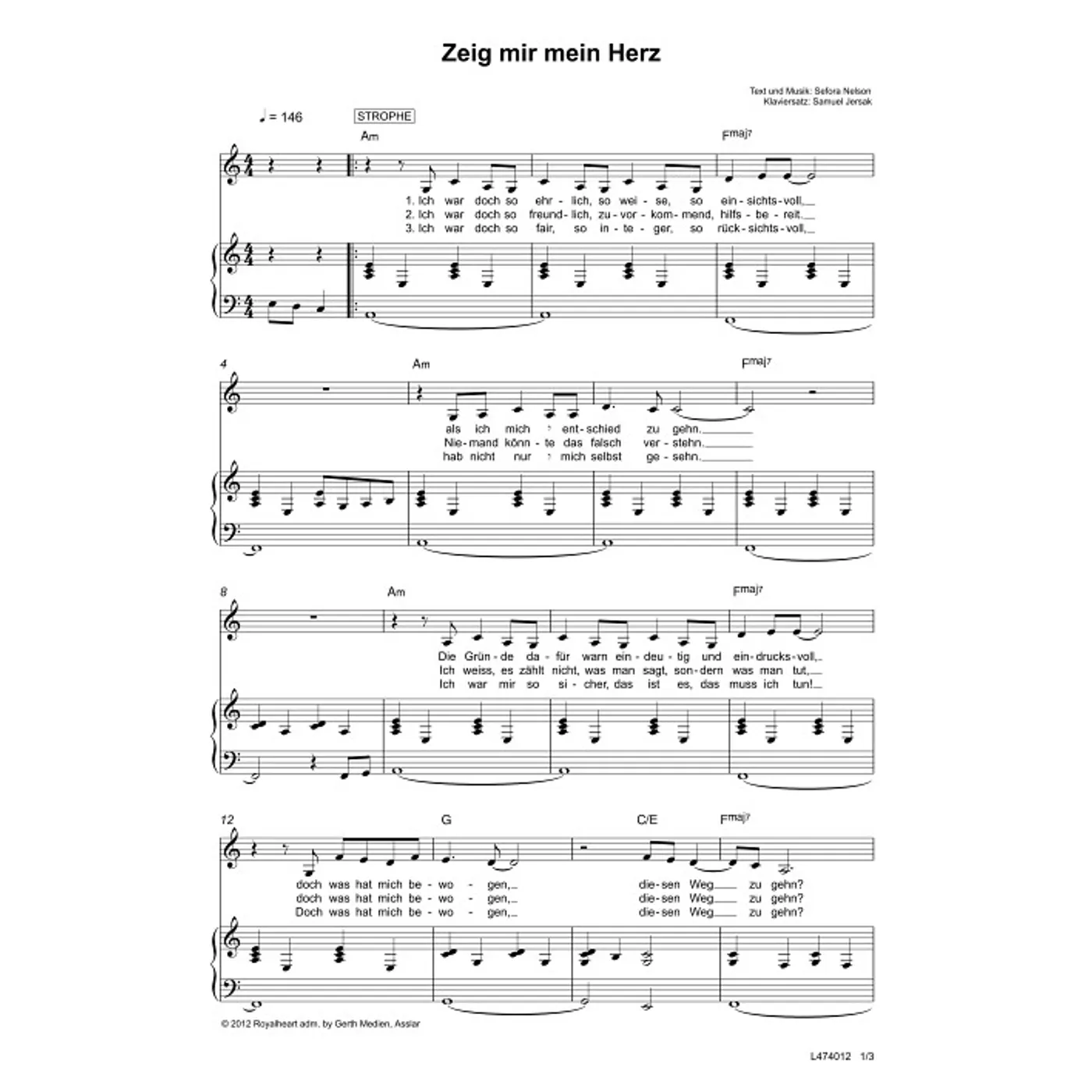 Zeig mir mein Herz (diese Variante haben Sie gerade ausgewählt) (modern, Klavier, einstimmig, mit Akkorden, a-moll-Moll) Samuel Jersak (Klaviersatz), Sefora Nelson (Komposition, Text) |