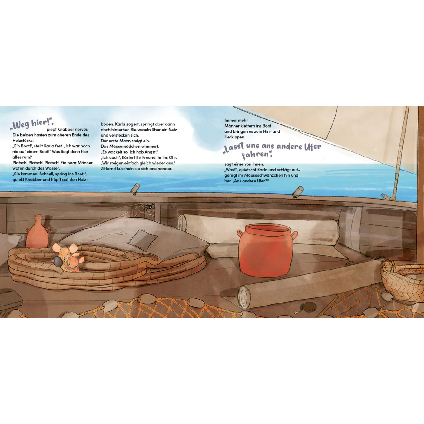 »Mit Karla und Knabber, den beiden süßen und verspielten Mäusen, muss man sich einfach anfreunden. Die beiden nehmen einen direkt mit hinein ins Boot der Jünger und man fiebert automatisch mit den beiden mit, wenn das Unwetter auf dem See Genezareth losgeht. Die Geschichte aus dem Blickwinkel der Mäuse zu betrachten hilft Kindern, sich in die Situation und die Angst der Jünger hineinzuversetzen, und Jesus mit staunendem Blick neu zu vertrauen.« Ann-Christin Pöhler, evangelische Religionslehrerin